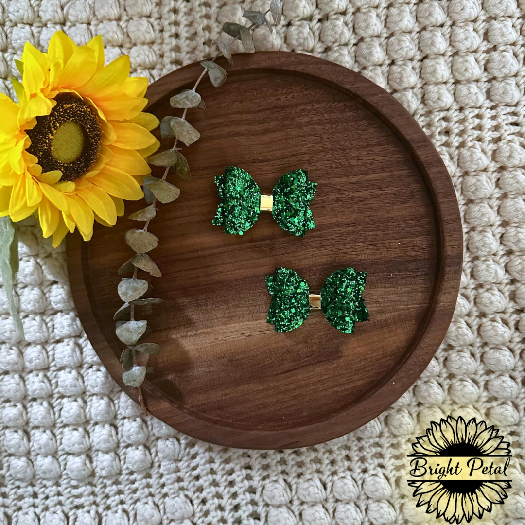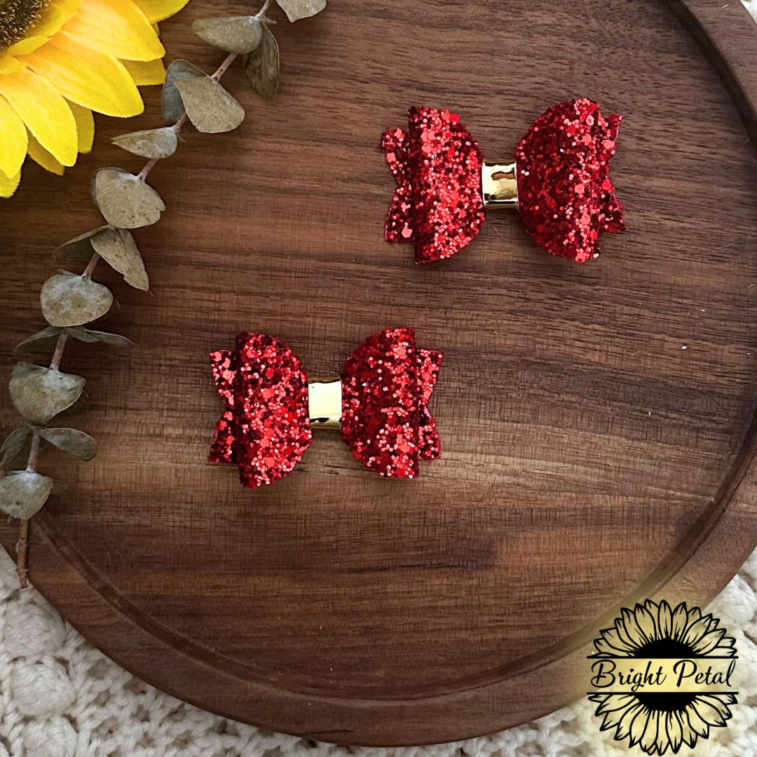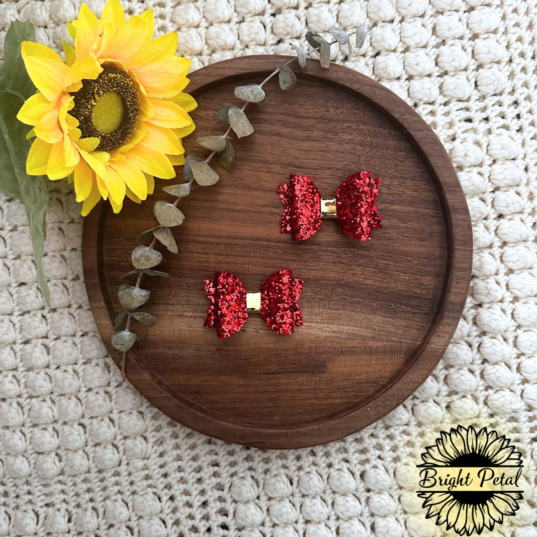 bright petal larger classic bows are the perfect addition for your holiday pjs. in vegan leather with a little gold detail, these sparkle bows are way too fun!