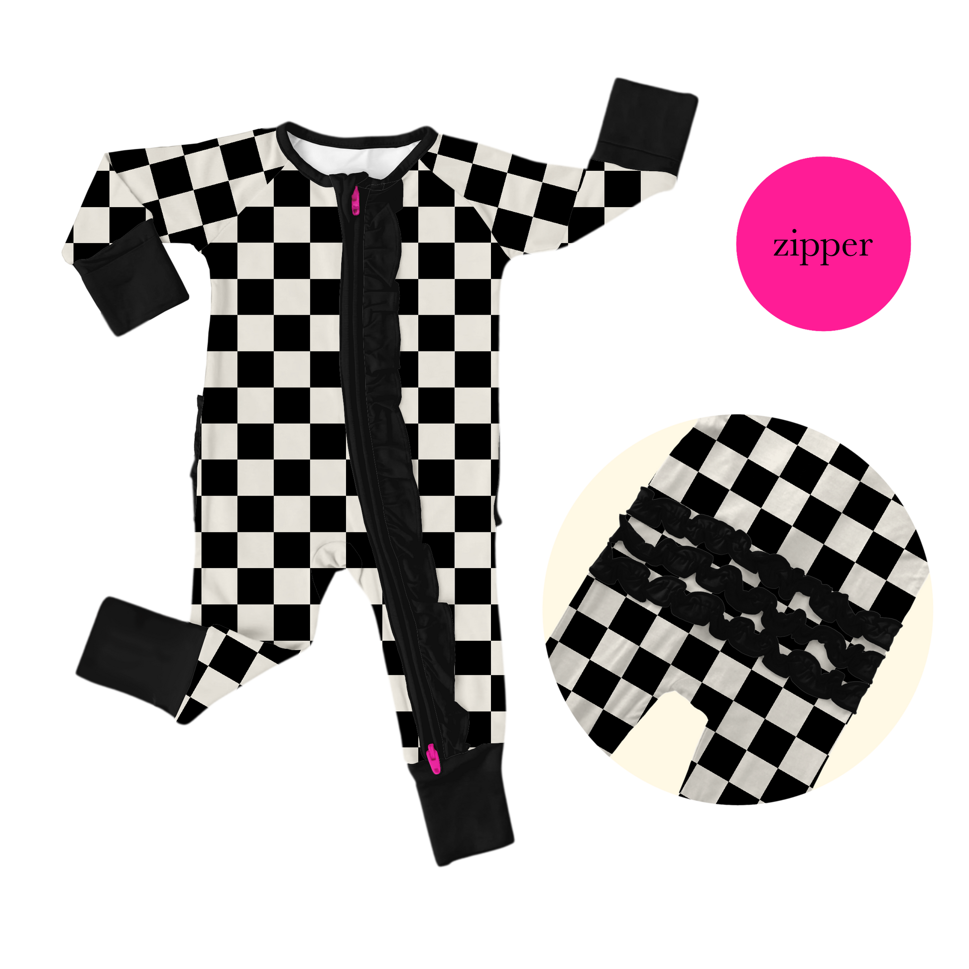 • the cutest contrasting pink YKK zipper (ruffled) or green zipper (no ruffles) with a zipper garage